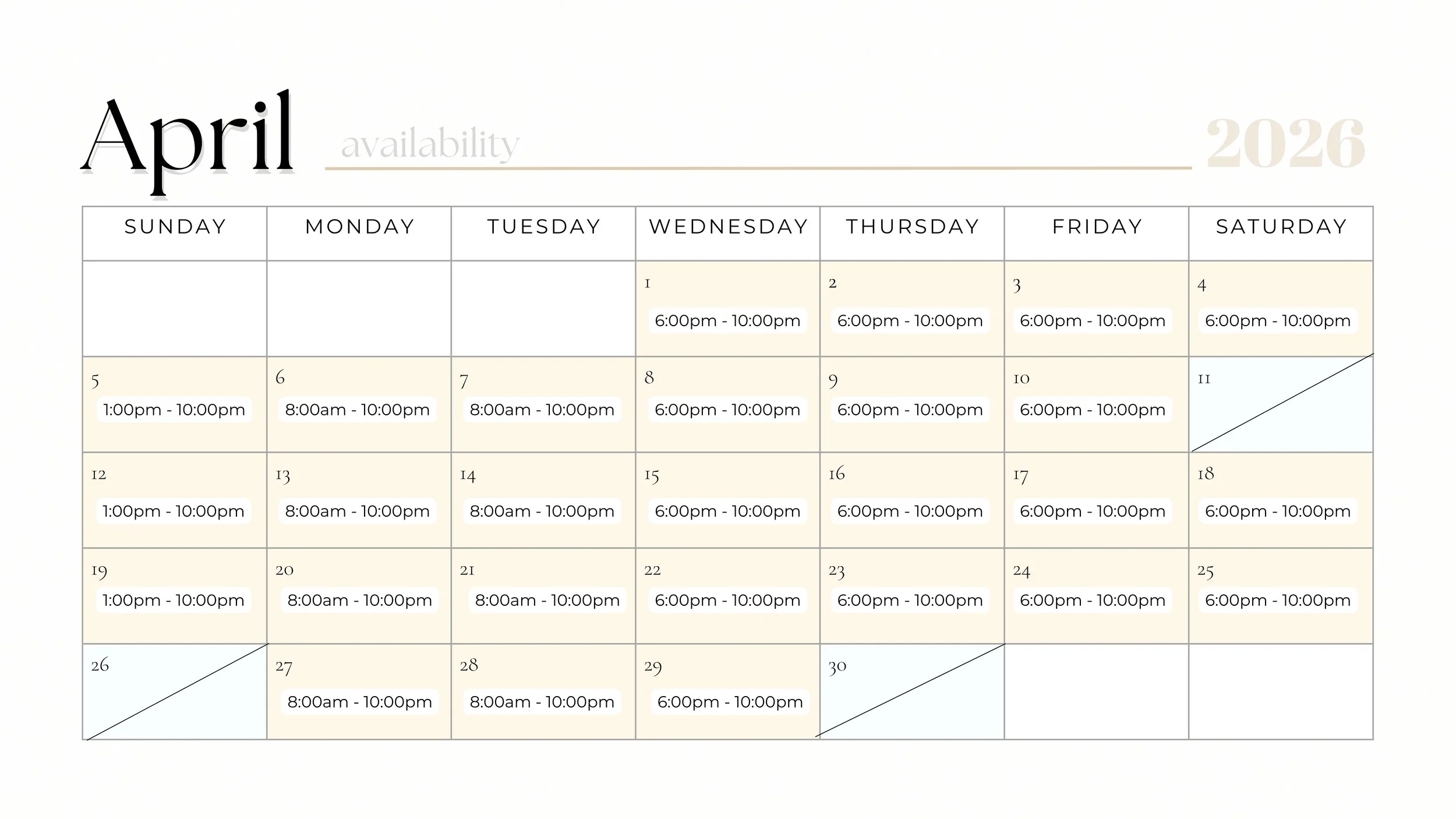 Submitting a booking request here does not secure or finalize your appointment. I will follow up by email within 1–2 business days to discuss your event or occasion in more detail and confirm your reservation. Your experience should be memorable, and our follow-up will ensure you’re provided the best possible service.